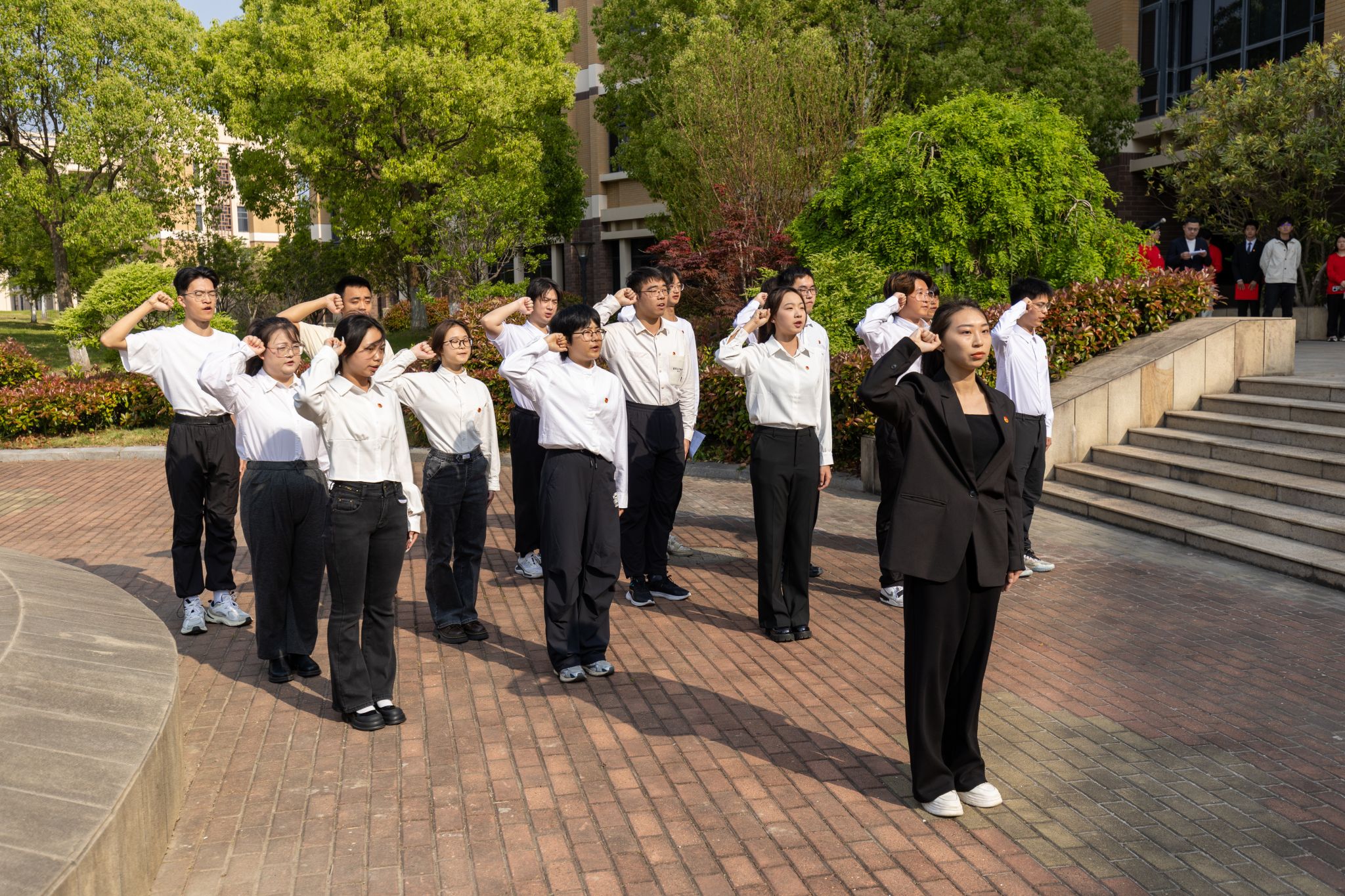 奉贤校区升国旗仪式现场,还举行了共青团员入团宣誓仪式,新团员代表面向团旗庄严宣誓,铿锵誓言展现了新时代上应青年赓续五四精神、勇担时代使命的决心和信念。这一刻,历史的厚重与青春的朝气交织,五四精神的火炬在新时代青年手中熠熠生辉。