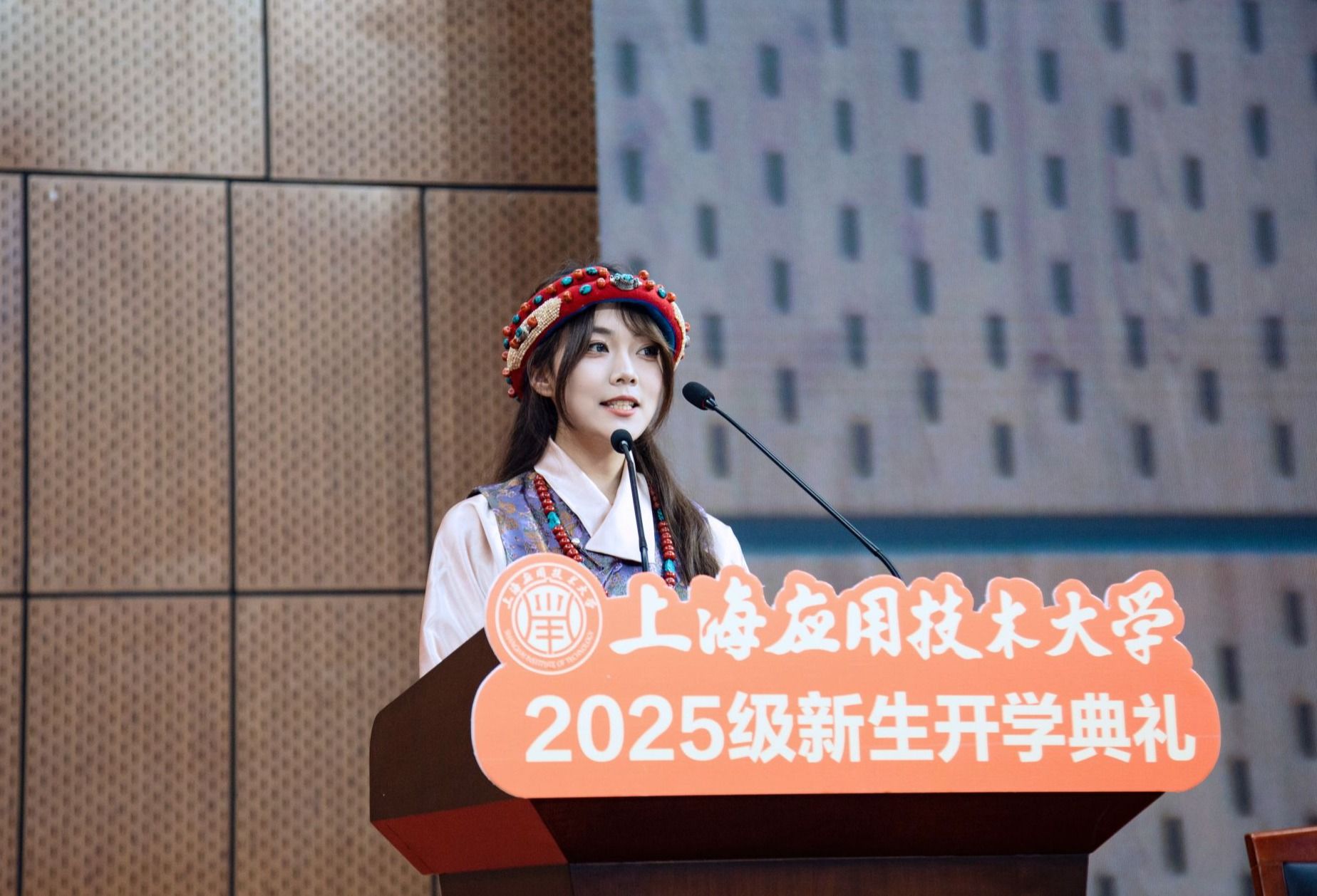 人文学院2025级本科生旦增卓玛作为新生代表发言。她表示,初入校园便感受到浓厚的学术氛围与温暖的人文关怀,在未来的学习生活中要脚踏实地、志存高远,做时代的见证者,更成为建设者。
